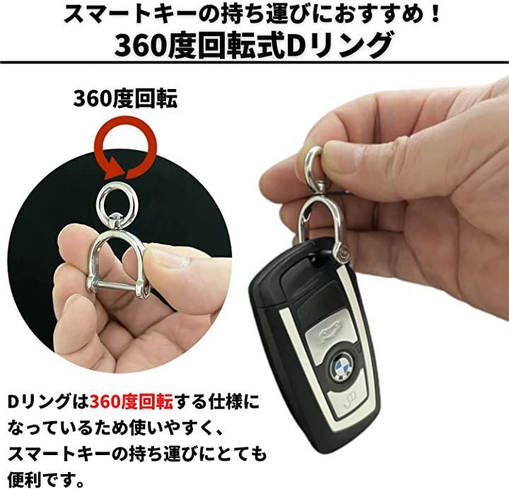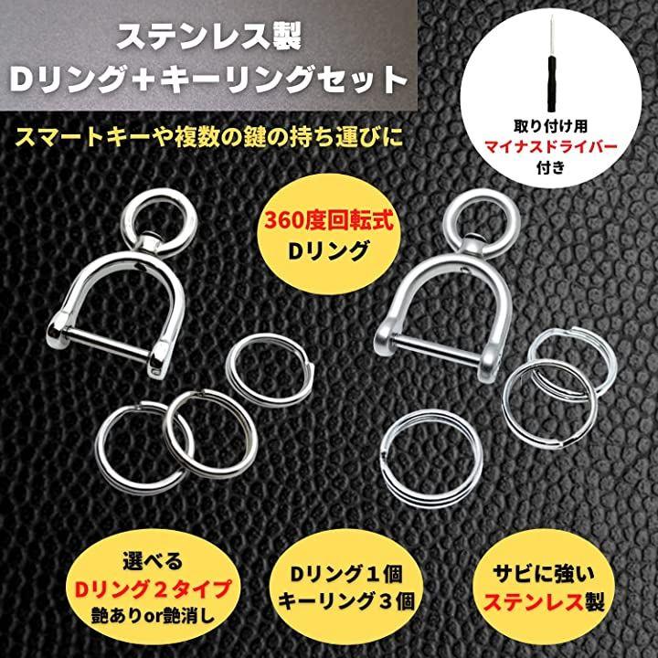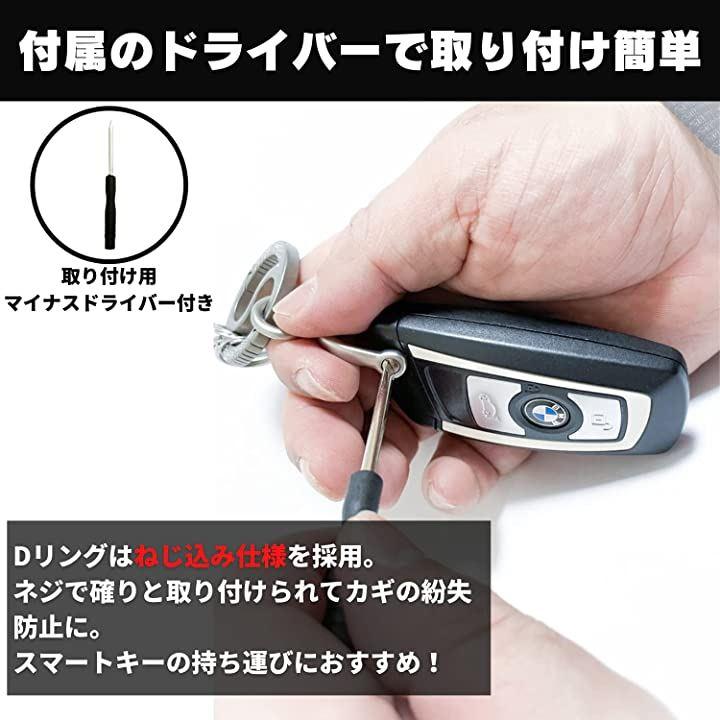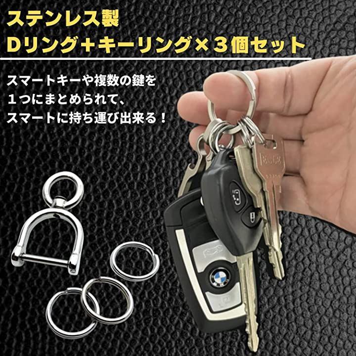 ・「ステンレス製Dリングセット」ステンレス製Dリングなのでサビに強く、スマートキーの持ち運びにおすすめ。複数の鍵の取付けに便利なステンレス製キーリング3個付き。