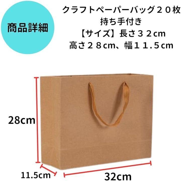 「商品詳細」クラフトペーパーバッグ20枚入・持ち手付き「サイズ」長さ32cm、高さ28cm、幅11.5cm