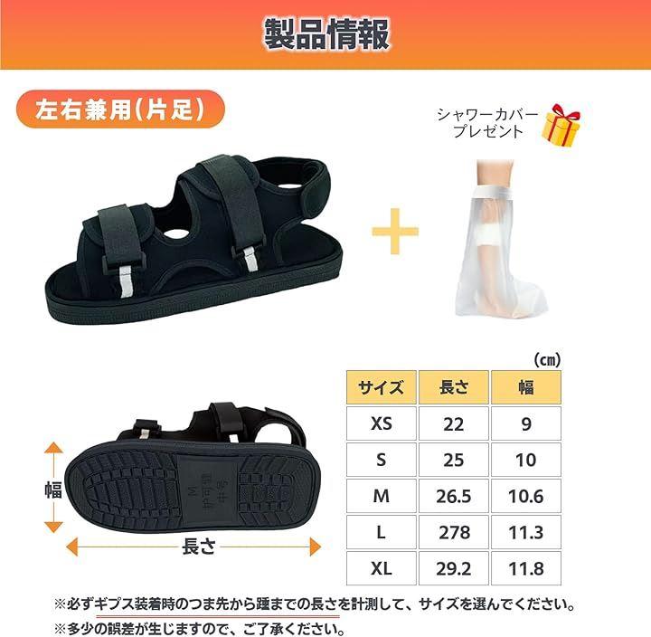 「商品詳細」 ・商品内容: ギプス用サンダル 1個(片足のみ・両足兼用)+ シャワー用カバー 1個 / ・カラー: ブラック / ・サイズ展開:XS: 底の長さ 22cm、S: 底の長さ 25cm、M: 底の長さ 26.5cm、L: 底の長さ 27.8cm、XL: 底の長さ 29.2cm / ・素材: メッシュ