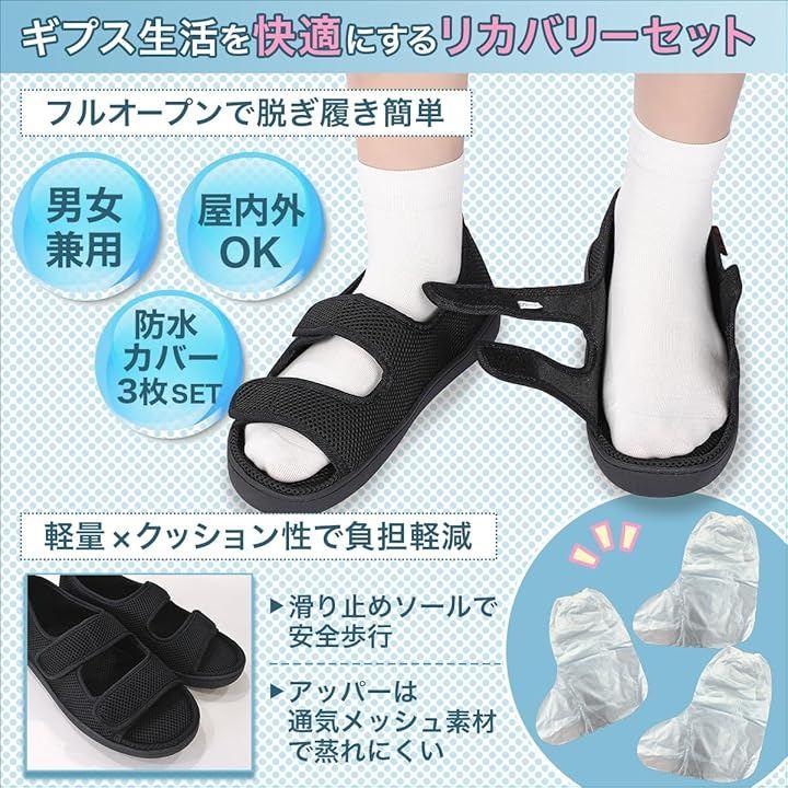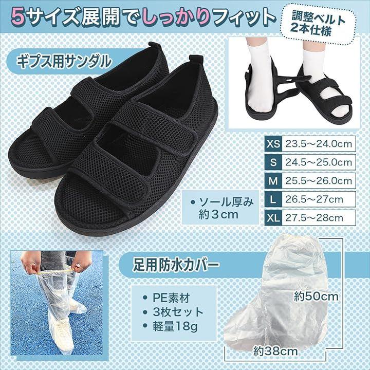 「商品詳細」 <セット内容>ギプスシューズ、防水カバーx3枚 <素材>シューズ:メッシュ・合成素材/カバー:PE <ベルト>調整ベルト2本 <サイズ>XS(23.5–24.0cm)、S(24.5–25.0cm)、M(25.5–26.0cm)、L(26.5–27.0cm)、XL(27.5–28.0cm)/カバー:約38x50cm <用途>介護・リハビリ・入院・外出・ケガの保護など
