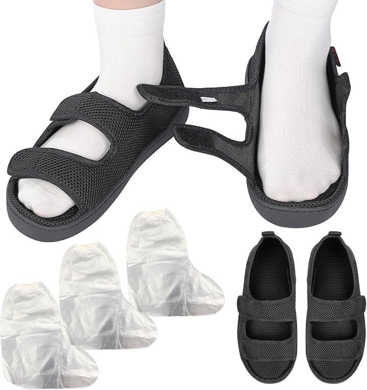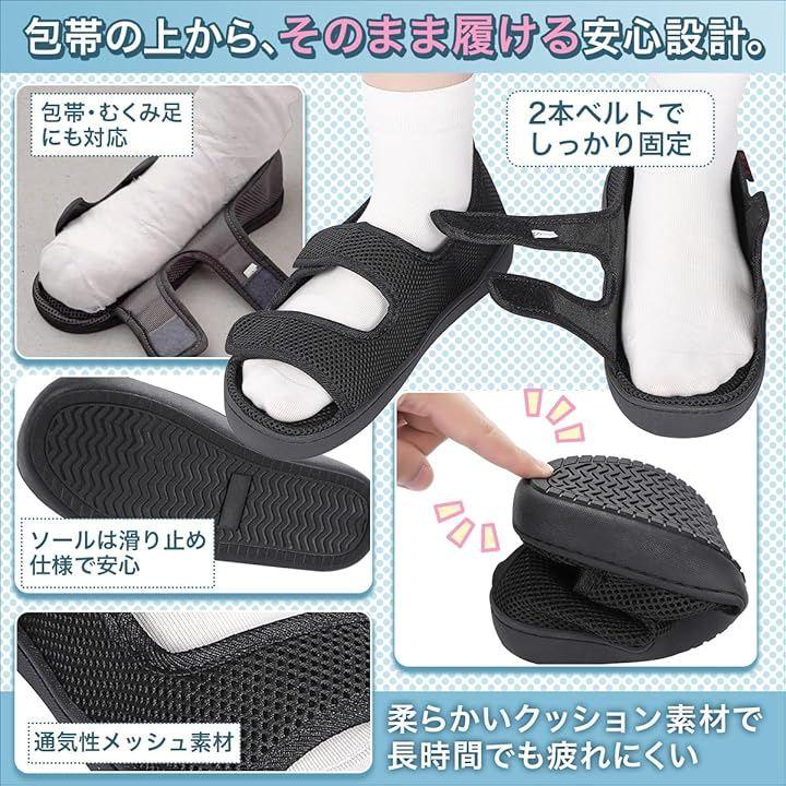 「商品詳細」 <セット内容>ギプスシューズ、防水カバーx3枚 <素材>シューズ:メッシュ・合成素材/カバー:PE <ベルト>調整ベルト2本 <サイズ>XS(23.5–24.0cm)、S(24.5–25.0cm)、M(25.5–26.0cm)、L(26.5–27.0cm)、XL(27.5–28.0cm)/カバー:約38x50cm <用途>介護・リハビリ・入院・外出・ケガの保護など