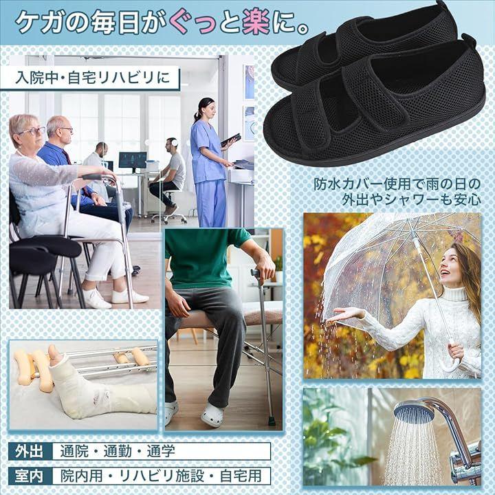 「商品詳細」 <セット内容>ギプスシューズ、防水カバーx3枚 <素材>シューズ:メッシュ・合成素材/カバー:PE <ベルト>調整ベルト2本 <サイズ>XS(23.5–24.0cm)、S(24.5–25.0cm)、M(25.5–26.0cm)、L(26.5–27.0cm)、XL(27.5–28.0cm)/カバー:約38x50cm <用途>介護・リハビリ・入院・外出・ケガの保護など