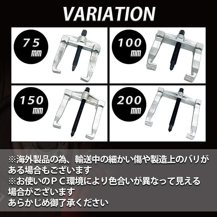 「100mm」内掛け(約):最大 65mm、外掛け(約):最大 140mm、重量(約):660g / 「75mm」内掛け(約):最大 45mm、外掛け(約):最大 115mm、重量(約):450g *プーラーのサイズ表記は規格サイズを表記したものです。