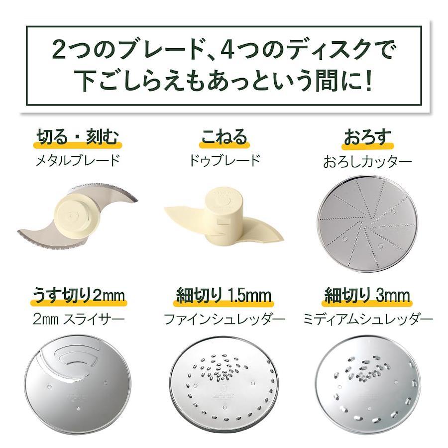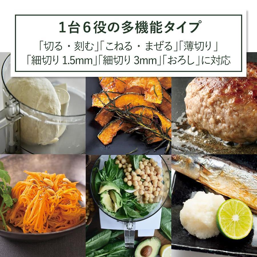 「切る・刻む」「こねる」「薄切り」「細切り(1.5/3mm)」「おろし」の1台5役