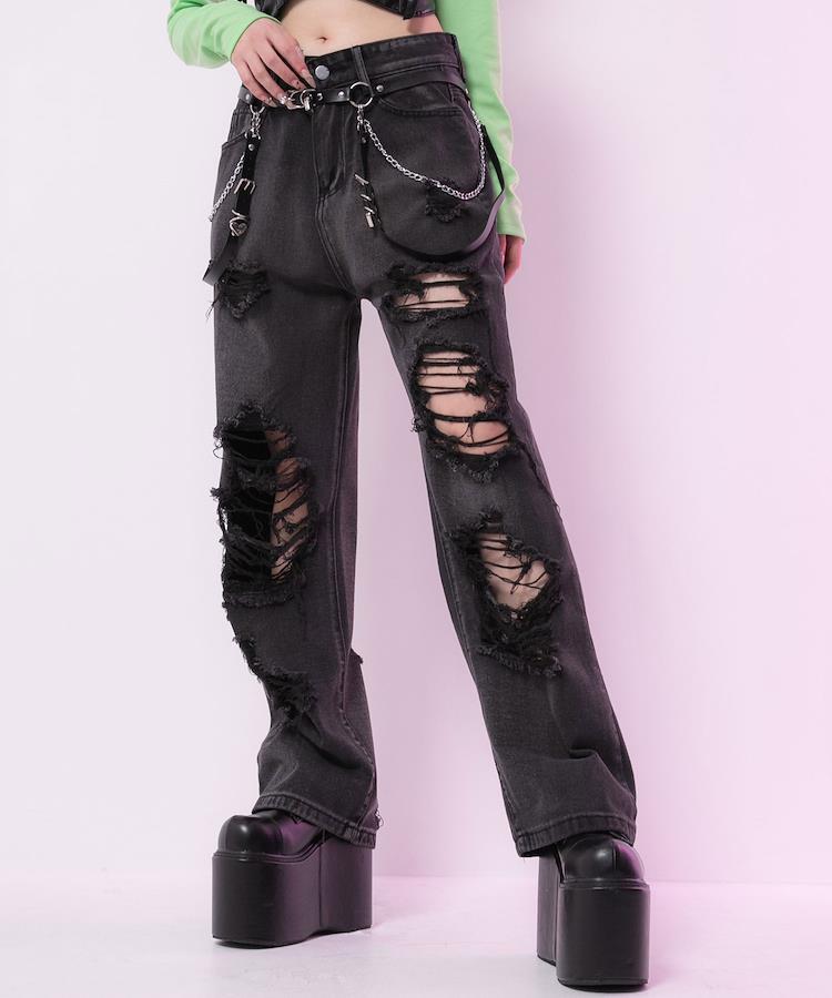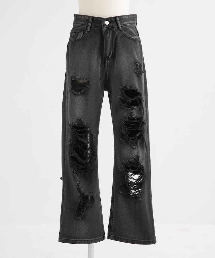 ◇POINT◇エッジィで攻め感MAXなクラッシュデニムで、視線独り占めのギャルスタイルに。大胆に施されたダメージ加工が、肌見せバランスを絶妙に演出こなれ感たっぷりのルーズシルエットで、美脚&脚長効果もバッチリです。チビTやクロップドトップスと合わせて、ウエストのチラ見せで色気UP。