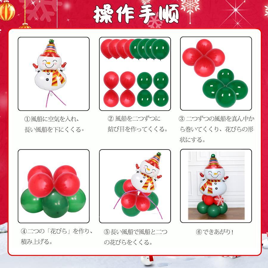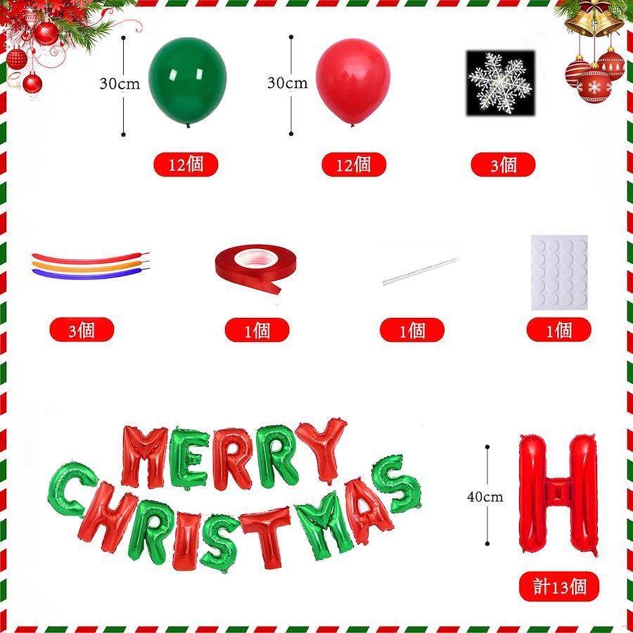 【セット内容】①Merry Christmas風船各文字×1 ②レッド風船×12 ③ミドリ風船×12 ④サンタクロース×1、クリスマスツリー×1、雪だるま×1、赤い色キャンディ×2、キャンディケイン×2 ④長い風船×3 ⑤スノーフレーク×3 ⑥小道具キット(リボンひも、両面テープ、ストロー) ⑦説明書(日本語)【厚しくした高品質のバルーン】各12インチラテックスバルーンは重さが2.8gで、より厚く、より弾力性があるので、空気やヘリウムガスで膨らませやすいです。強力な弾力性及び厚手の素材により、バルーンは空気が漏れにくく、その美しい形を長時間維持することができます。【高品質の風船】私たちの風船は、耐久性のあるアルミ箔と強力なラテックスで作られています。環境に優しい、耐久性と非毒性、爆発するのは容易ではなく、長寿命を持っています、彼らは子供のために使用することは安全です。自信を持ってご利用いただけます。【パーフェクトなクリスマス撮影用キット】このクリスマスバルーンデコレーションがあれば、一気にクリスマスの雰囲気を作り出すことができ、お子様たちがクリスマスを祝っているとき、その可愛い笑顔をあますことなく捉えることができます。夢のようなクリスマスパーティーを楽しんでください。【免責事項】メーカーによる商品リニューアルに伴いパッケージ(内容量も含む)変更が行われた場合、新パッケージでお届け致します事ご了承願います。