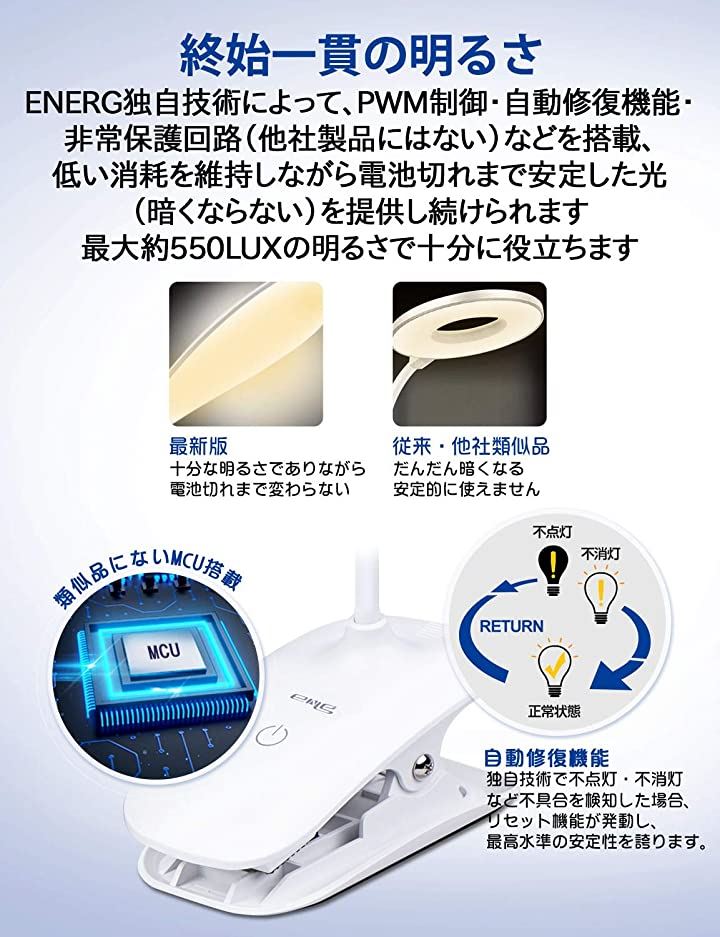 ・「技術の集大成で作られた」ENERG独自技術によって、PWM制御・自動修復機能・非常保護回路装置(他社製品にはない)などを搭載、高い安全性・安定性と低い消耗を維持しながら電池切れまで安定した光(暗くならない)を提供し続けられます。