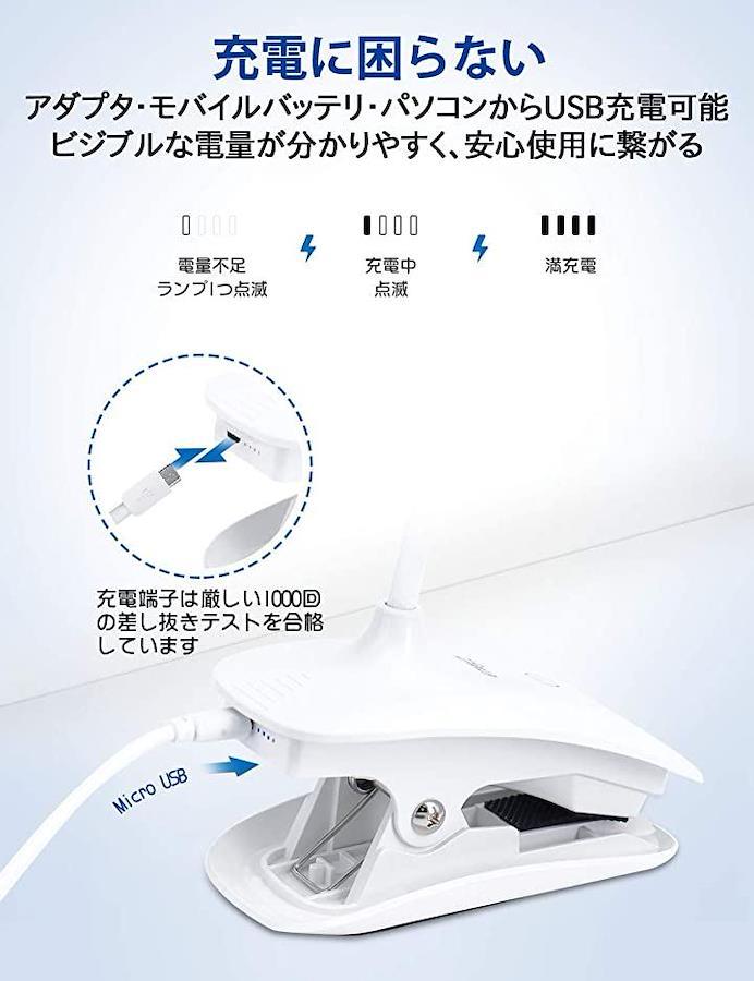 *3200mAhバッテリー内蔵のこのクリップライトは、満充電した状態で15時間以上(弱モード)使用できます。