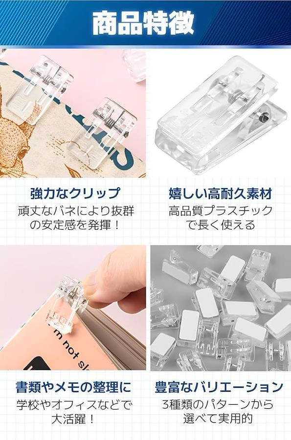 「商品特徴」(1)強力なクリップ:頑丈なバネにより抜群の安定感を発揮。/(2)嬉しい高耐久素材:高品質プラスチックで長く使える/(3)書類やメモの整理に:学校やオフィスなどで大活躍。/(4)豊富なバリエーション:3種類のパターンから選べて実用的