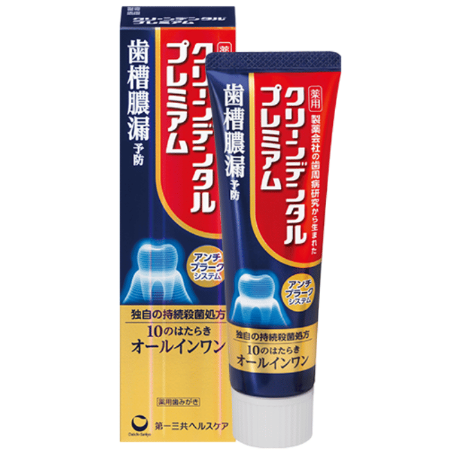 クリーンデンタルプレミアムは2種の殺菌成分と2種の消炎成分、さらにフッ素やゼオライトなど、合計10種の薬用成分を配合し、歯周病の予防はもちろん歯石沈着の防止やむし歯予防まで、歯と歯ぐきの10の悩みをこの一本でオールインワンケアします。