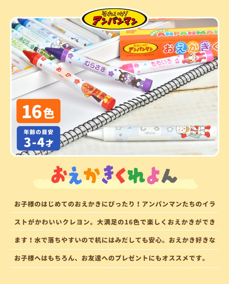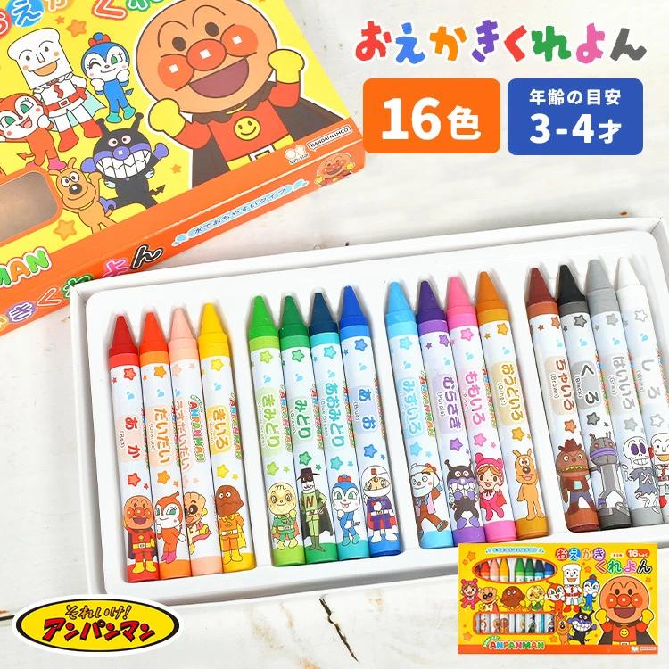 【おえかきくれよん】お子様のはじめてのおえかきにぴったり!アンパンマンたちのイラストがかわいいクレヨン。おえかき好きのお子様も大満足の16色!それぞれ違ったキャラクターの絵が描かれているので、色の名前を覚えながら楽しく塗り絵やおえかきができます。水で落ちやすいので机や床にはみだしても安心。おえかき好きなお子様へはもちろん、お友達へのプレゼントにもオススメです。
