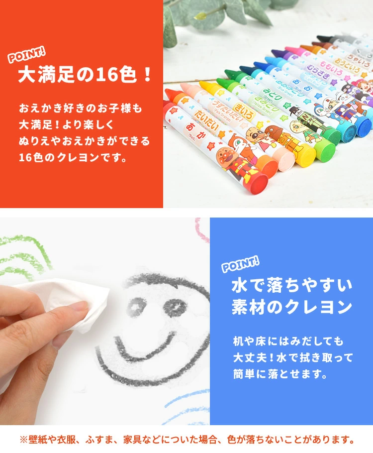 ◇16色入り◇色ごとに違うキャラクターの絵柄付き◇水で落ちやすいタイプ◇箱の裏面とクレヨン1本1本にお名前スペース付き◇丸軸