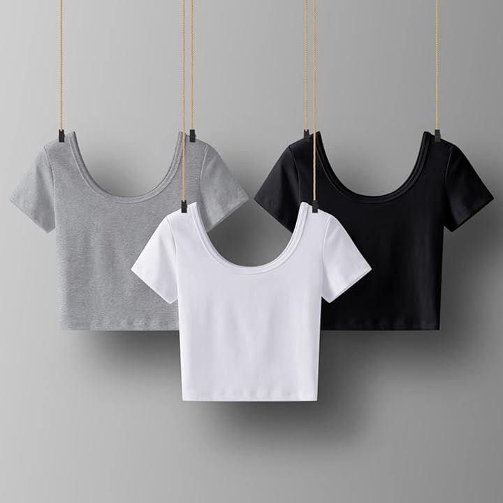クロップド丈のトップスはハイウエストのボトムとコーデを組んでも決まります。