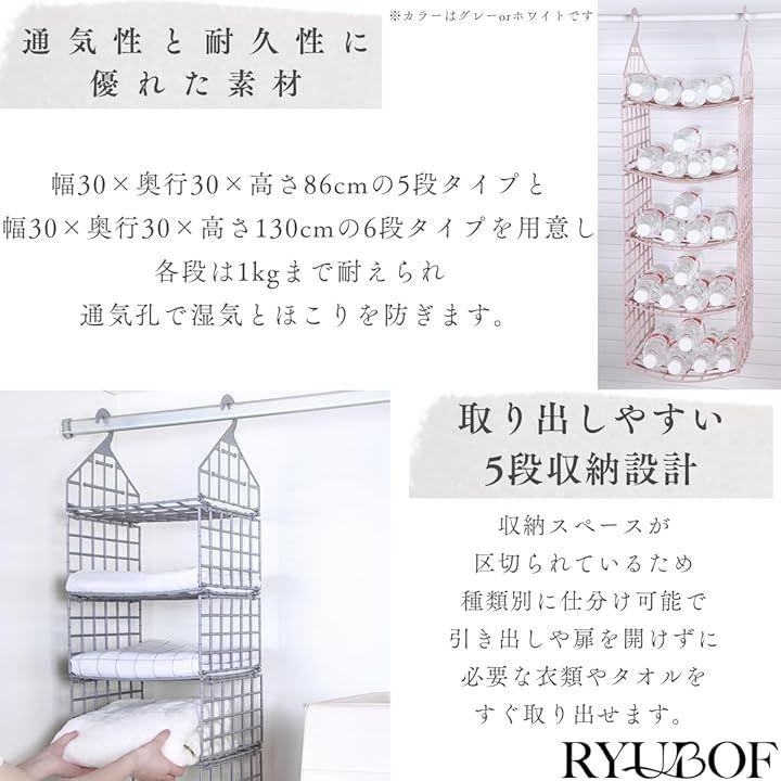 「通気性と耐久性に優れた素材」幅29x奥行29x高さ86cmの5段タイプと幅29x奥行29x高さ130cmの6段タイプを用意し、各段は1kgまで耐えられ通気孔で湿気とほこりを防ぎます。