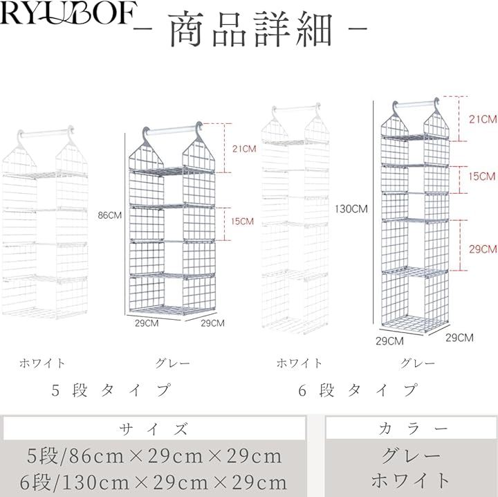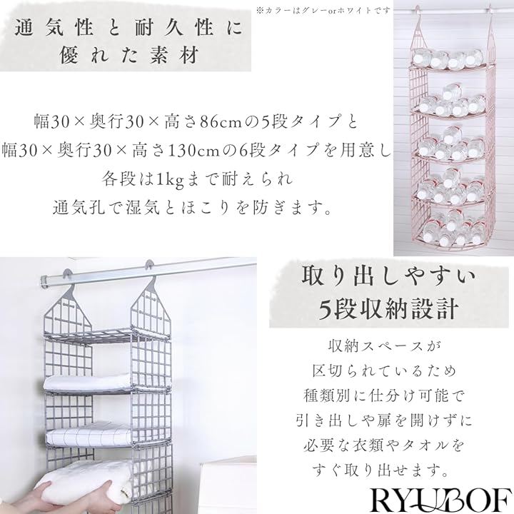 「通気性と耐久性に優れた素材」幅30x奥行30x高さ86cmの5段タイプと幅30x奥行30x高さ130cmの6段タイプを用意し、各段は1kgまで耐えられ通気孔で湿気とほこりを防ぎます。