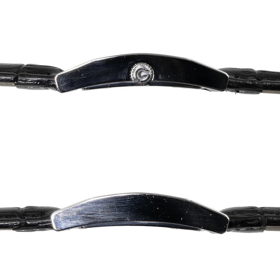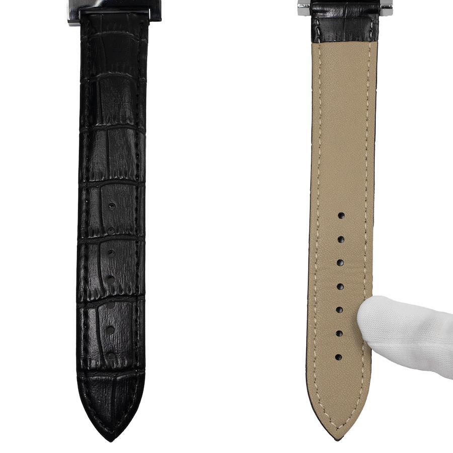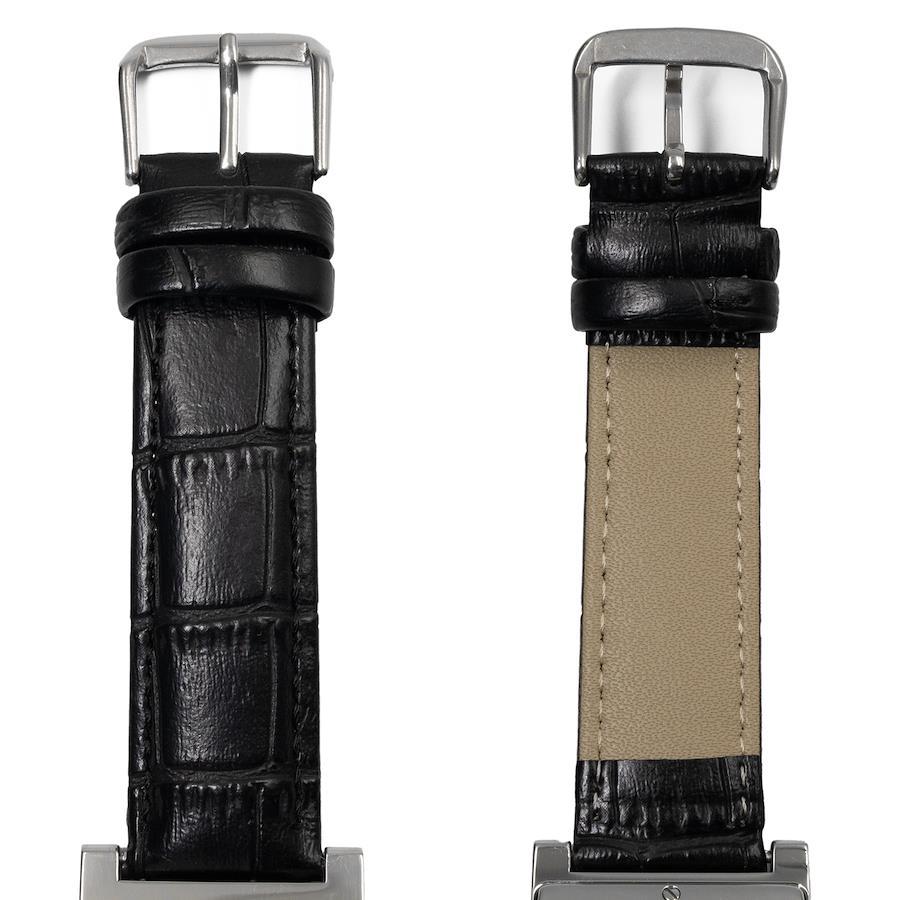 クラシカルなスクエアケースと、シックなブラックの革ベルトの組み合わせは、まさに王道と呼べるデザインでございます。