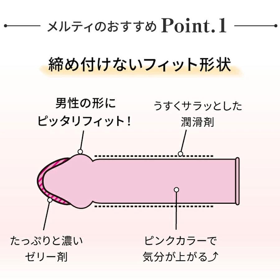 「メルティゼリー」とフィット形状ゴムの組み合わせで、お互いの一体感を高めます。いつもより相手を感じたい、そんな2人へ濃密な時間をお届け。●とろけるような一体感「メルティゼリー」付。●締め付けないフィット形状。●優れたフィット感のラテックス製。●先端にゼリーを留める独自技術「ジェルトップ加工」を採用しています。女性側に厚みのある水溶性ゼリーがたっぷりなので、性交時のうるおい不足による不快感を感じる方におすすめ。●空気抜き不要で装着カンタン。●小さな穴あきもないように、全品電流試験チェック済み。●ピンクカラー。