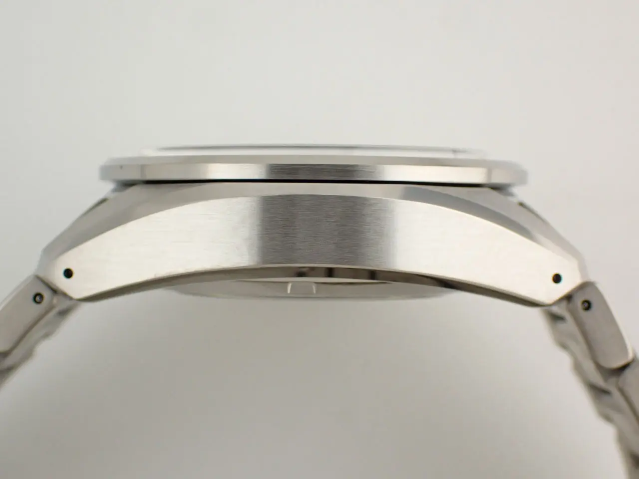 こちらは、磨き分けが美しい「エボリューション9」。ダイヤルデザインは「朝霧」をイメージした繊細な仕上がり。それに対して堂々たるインデックスと時分針が存在感抜群ですね。やや細目のベゼルは歪みのない完璧な平滑面。全体にボリュームがありますが、ブライトチタンを使用し軽やかな装着感です。