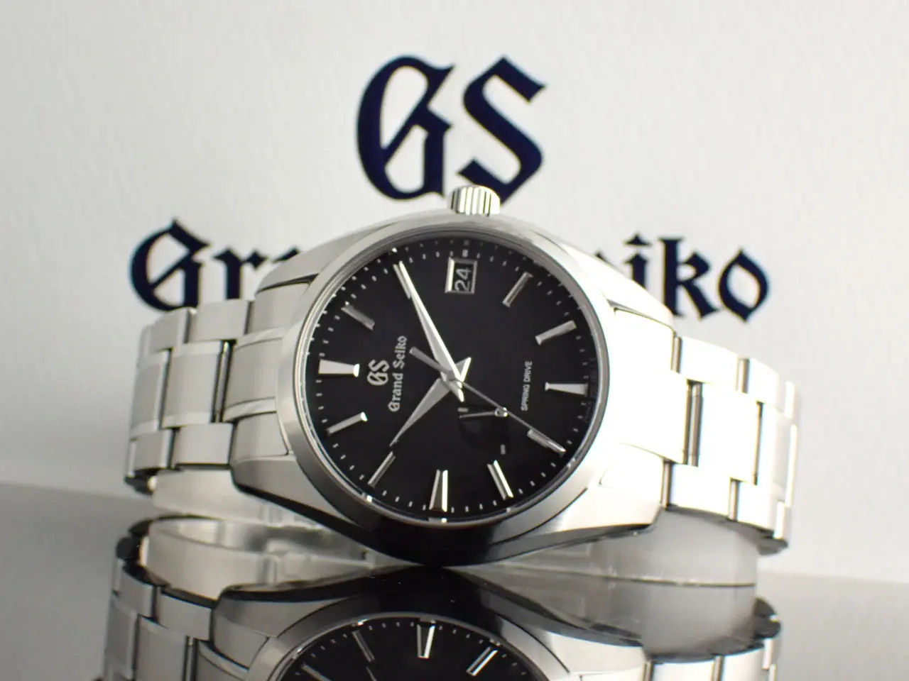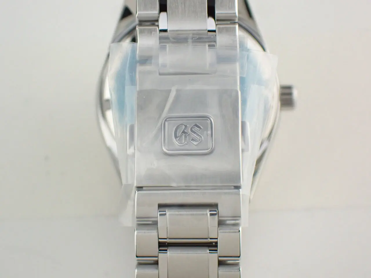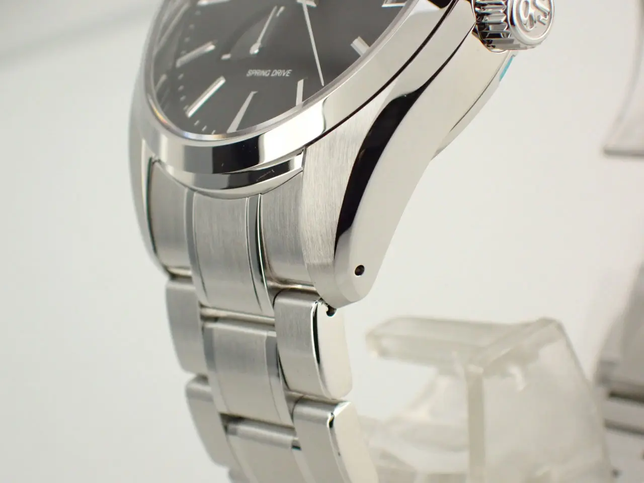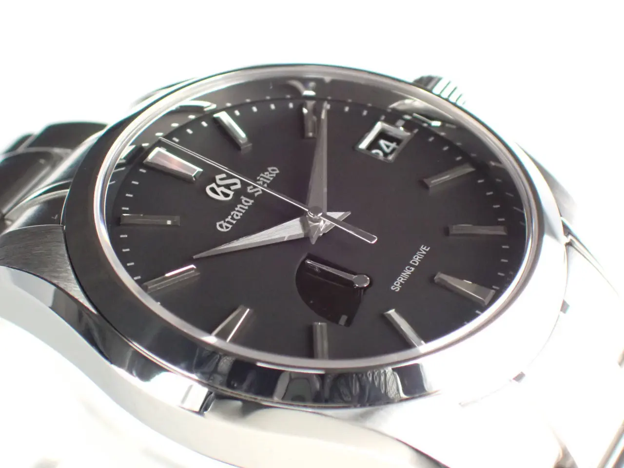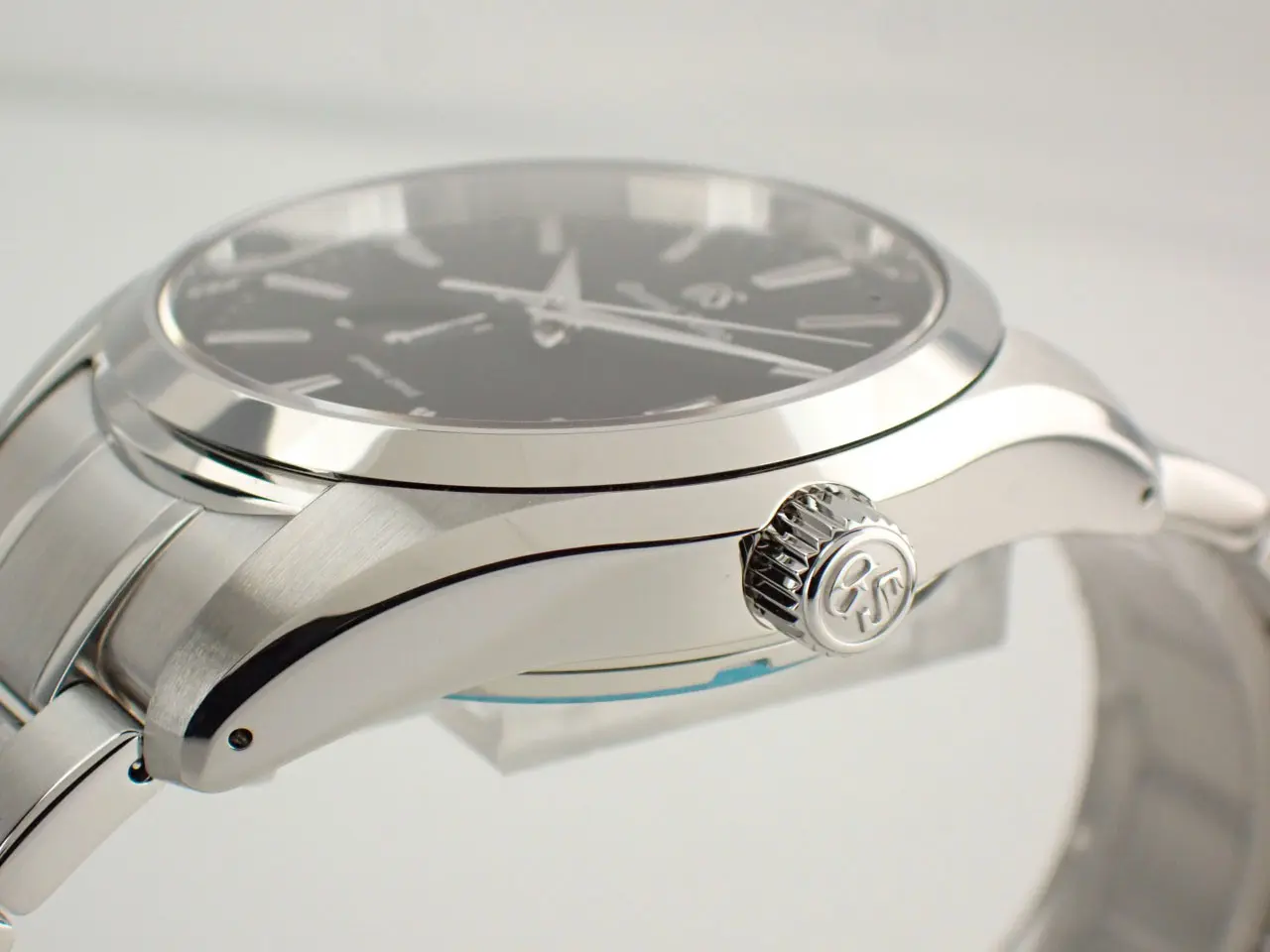 こちらの時計は、同社開発の「スプリングドライブ」を搭載した最初のモデルで、ロングセラーを誇るモデル。ダイヤルは深みのあるブラックカラー。インデックスはバーと楔の組合せ。ファセットカットが多面的に光を捉え、視認性も抜群です。ブラックとシルバー、削ぎ落されたミニマルな印象ですが、長年愛されているGSのスタンダードを最も感じられるモデルとも過言ではありません。