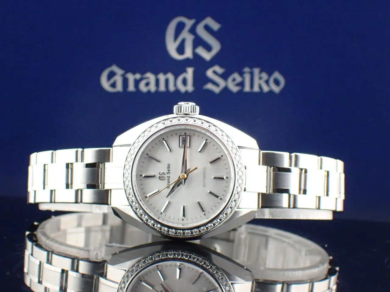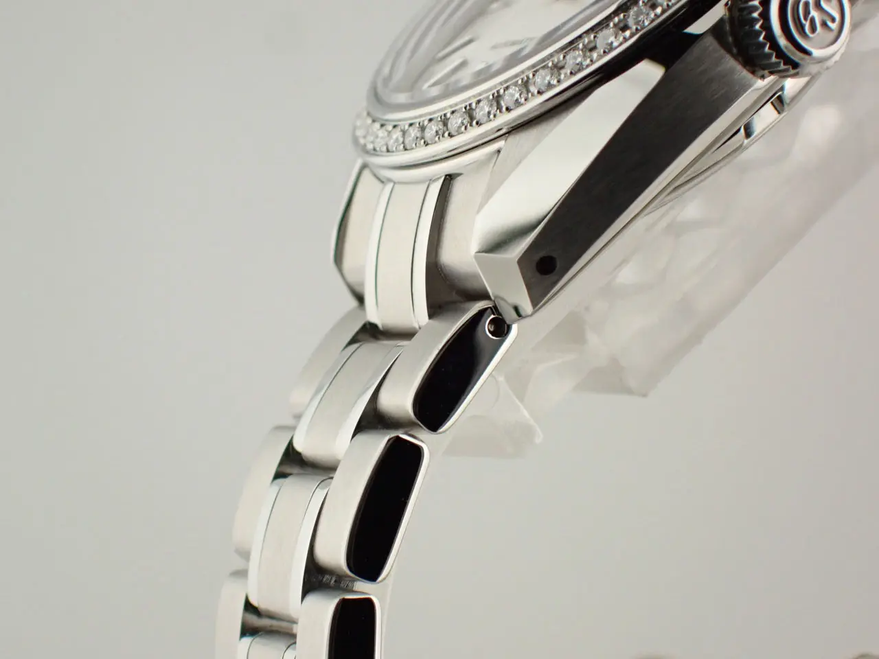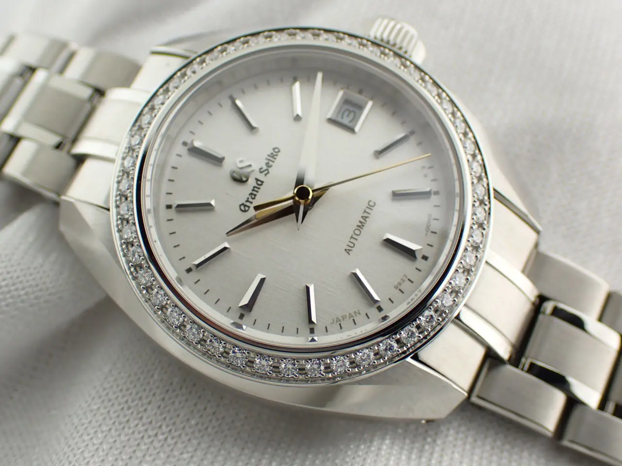 こちらは、グランドセイコーのレディースモデル。ヘリテージコレクションのメカニカル腕時計です。/n小型ながら本格的なメカニカルムーブメントキャリバー9S27を搭載。約50時間のパワーリザーブを誇ります。/n美しい絹の布のような型打模様にパール仕上げの文字盤は美しさの極み。/n華やかなベゼルはステンレススチールにダイヤモンド45個(約0.41カラット)を配しています。/nさらにサファイアガラスのシースルーバックからは、熟練の職人による美しいムーブメントの動きを鑑賞できるのも魅力。