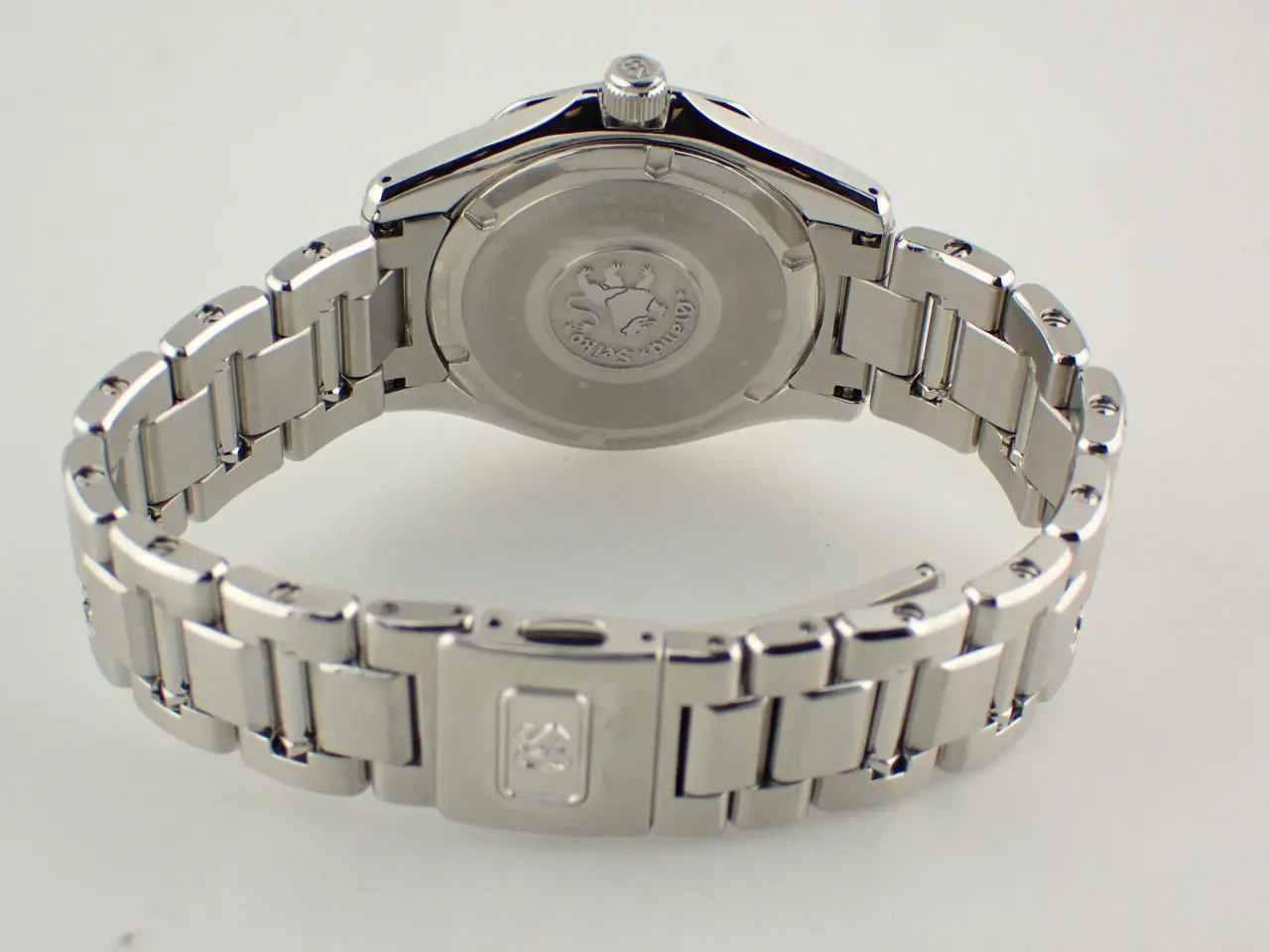 こちらは、現在では生産終了しているモデル。ダイヤルは艶やかなブラックカラー。12と6時位置のみアラビア数字であったり、バー部分もファセットカットを施したりと、シンプルながらディティールが光る外観です。ベゼルは現在生産しているメーカーはとても少ない、多角仕様。加工に膨大な手間と時間がかかりますが、見た目の存在感は絶大です。立ち上がったリューズガードは堅牢性を誇示します。