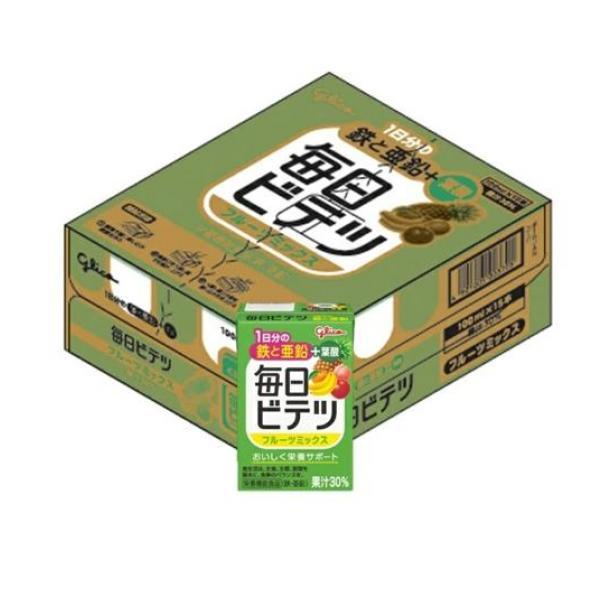 製品の特徴●グリコ 毎日ビテツ フルーツミックス●1日分の鉄と亜鉛+葉酸●おいしく栄養サポート●鉄分や妊娠中に大切な亜鉛に加え、葉酸、カルシウム、食物繊維など、6種類の栄養素が手軽に摂れます。●1本100mLの飲み切りやすいサイズ。●りんご、パイナップル、バナナの3つの果汁をブレンドし、ほどよい甘さで後味スッキリ。●果汁30%●紙パックドリンク●栄養機能食品(鉄・亜鉛)◇鉄は、赤血球を作るのに必要な栄養素です。◇亜鉛は、味覚を正常に保つのに必要な栄養素です。◇亜鉛は、皮膚や粘膜の健康維持を助ける栄養素です。◇亜鉛は、たんぱく質・核酸の代謝に関与して、健康の維持に役立つ栄養素です。●名称:30%混合果汁入り飲料