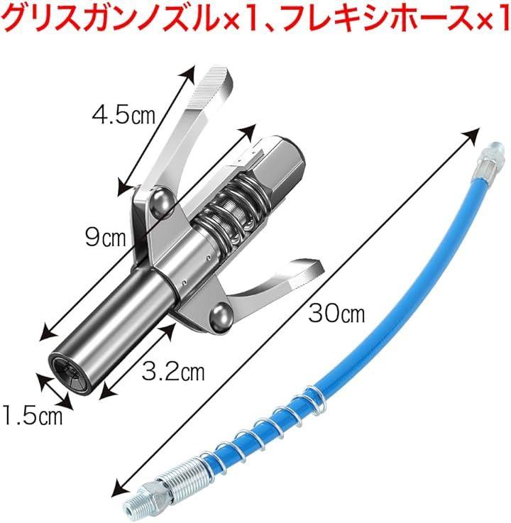 「商品詳細」本体:グリスガンノズルx1個、フレキシホースx1本 サイズ:グリスガンノズルの長さ9cm、フレキシホースの長さ30cm