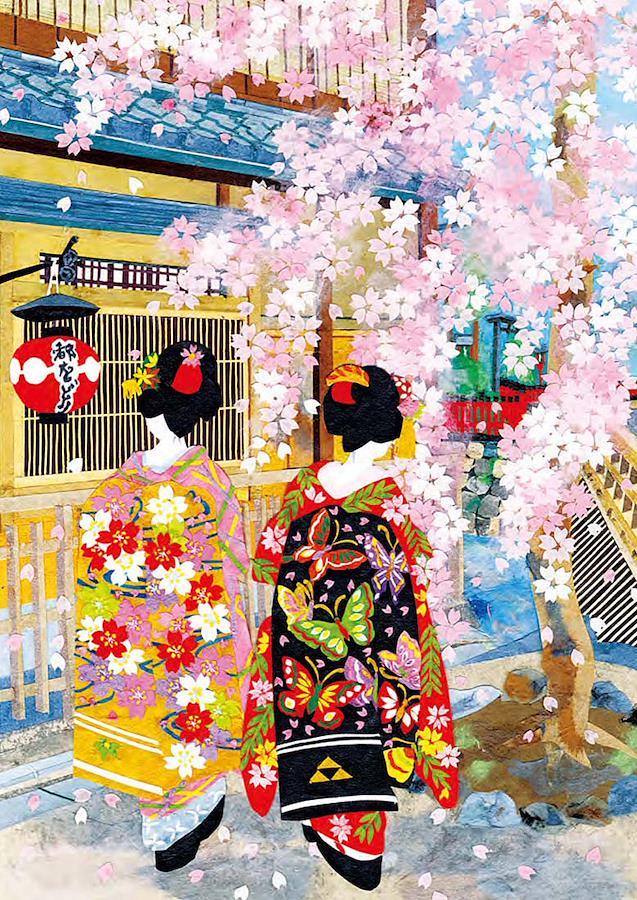 舞妓の風景を描いた貼り絵風のグリーティングカードです。