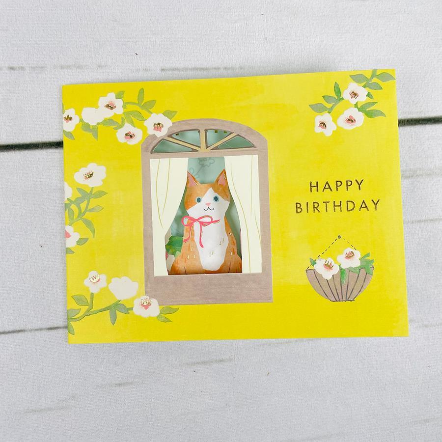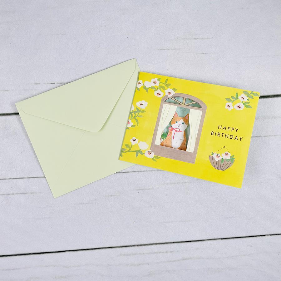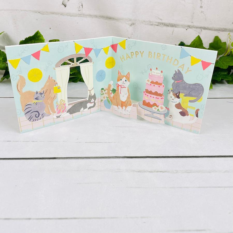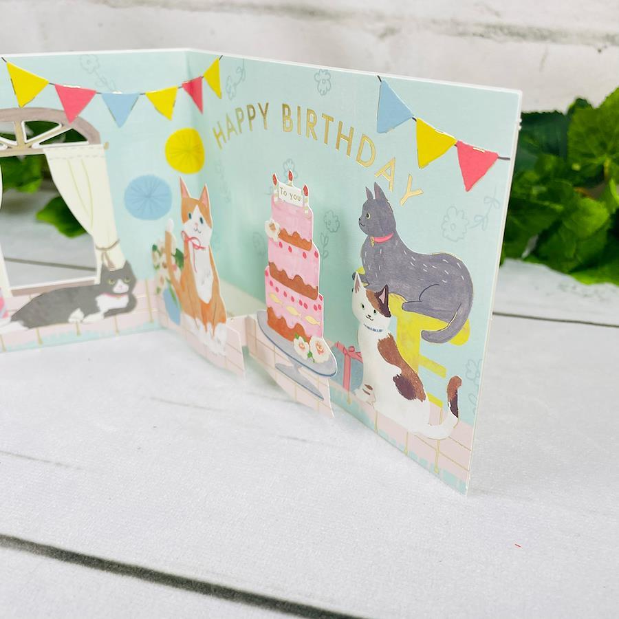 外国の絵本のような色合いで描かれたバースデーパーティの様子が楽しいポップアップカードです。裏面にメッセージを書くことができます。封筒付きです。