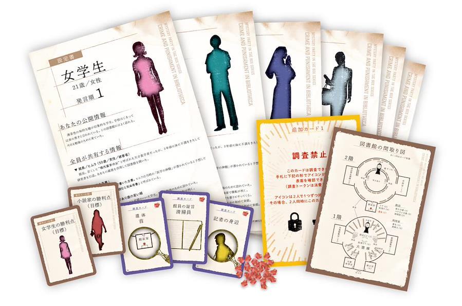 MYSTERY PARTY IN THE BOX SERIES作品。 1960年代末、日本。 西洋風のモダンな図書館には、「読むと死ぬ奇書」が秘蔵されているとの噂があった。 事件は、図書館の開館三周年記念の日に起きる。 記者のインタビューに答える予定だった時刻に、司書が館長を呼びに行ったところ、いつもは鍵のかかっていない館長室のドアがしまっている。 司書が鍵を持ってきて開けると、なんと室内では館長が事切れていた。 密室にいたはずの遺体は、こちらに背を向けた椅子に座り、胸にはドストエフスキー著『罪と罰』を抱いていた。 これは自殺か? あるいは――。 司書長や小説家といった本にまつわる容疑者、不気味な奇書の噂、絡み合う過去の事件。 物語の結末はどこへ向かうのか? めくられたページは、もう戻らない。 「選択型の目標」システムや、図書館を舞台にした本格ミステリーが見どころの、 マーダーミステリー初心者からベテランプレイヤーまで楽しめる内容となっています。 プレイ人数:5-6人 プレイ時間:150分 対象年齢:15歳以上 ゲームデザイン:河端ジュン一 アートワーク:タンサン プレイ人数 :5-6人 プレイ時間 :150分 対象年齢 :15才以上 素材:紙