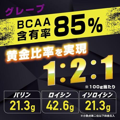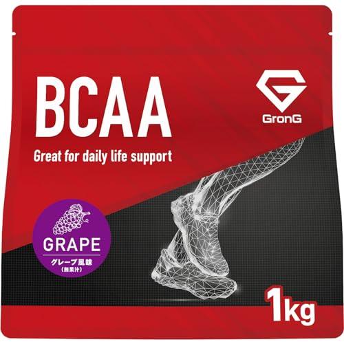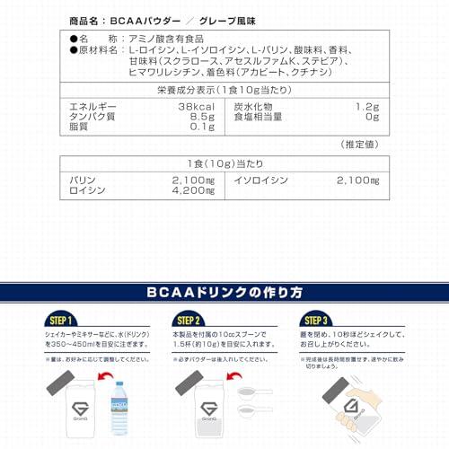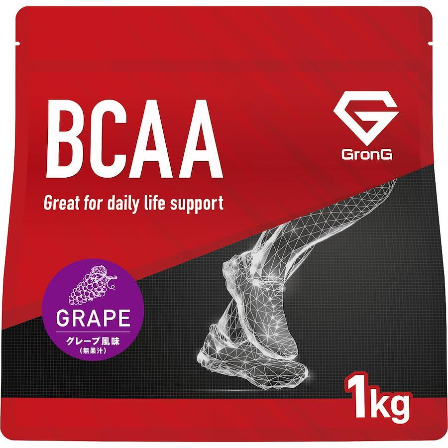 BCAAとは「Branched Chain Amino Acid」の略称で、「分岐鎖(ぶんきさ)アミノ酸」と呼ばれています。BCAAは、バリン・ロイシン・イソロイシンという3つの必須アミノ酸で構成されています。※必須アミノ酸:体内で合成することが「できない」アミノ酸なので、食事から補給する必要があります。 【GronG BCAAの特徴】 BCAA高配合 / 「1:2:1」のBCAA黄金比 / 飲みやすさ ●グレープ風味 おすすめの摂取タイミング(目安):トレーニング(運動)前・中・後 ●お召し上がり方(目安):付属のスプーンで1.5杯(約10g)を目安に、水またはお好みのドリンク350~450mlに溶かしてお召し上がりください。水またはドリンクの量は、お好みに応じて調節してください。 原材料名:L-ロイシン、L-イソロイシン、L-バリン、酸味料、香料、甘味料(スクラロース、アセスルファムK、ステビア)、ヒマワリレシチン、着色料(アカビート、クチナシ) 栄養成分(10g)当たり:エネルギー/38kcal、タンパク質/8.5g、脂質/0.1g、炭水化物/1.2g、食塩相当量/0g ※推定値 ●内容量:1,000g
