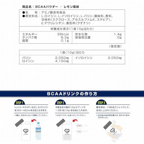 BCAAとは「Branched Chain Amino Acid」の略称で、「分岐鎖(ぶんきさ)アミノ酸」と呼ばれています。BCAAは、バリン・ロイシン・イソロイシンという3つの必須アミノ酸で構成されています。※必須アミノ酸:体内で合成することが「できない」アミノ酸なので、食事から補給する必要があります。 【GronG BCAAの特徴】 BCAA高配合 / 「1:2:1」のBCAA黄金比 / 飲みやすさ ●レモン風味 おすすめの摂取タイミング(目安):トレーニング(運動)前・中・後 ●お召し上がり方(目安):付属のスプーンで1.5杯(約10g)を目安に、水またはお好みのドリンク350~450mlに溶かしてお召し上がりください。水またはドリンクの量は、お好みに応じて調節してください。 原材料名:L-ロイシン、L-イソロイシン、L-バリン、酸味料、香料、甘味料(スクラロース、アセスルファムK、ステビア)、ヒマワリレシチン、着色料(クチナシ) 栄養成分(10g)当たり:エネルギー/38kcal、タンパク質/8.3g、脂質/0.1g、炭水化物/1.4g、食塩相当量/0g ※推定値 ●内容量:1,000g (#lf)(#lf)(#lf)商品購入前に、ストア紹介ページをご確認ください。