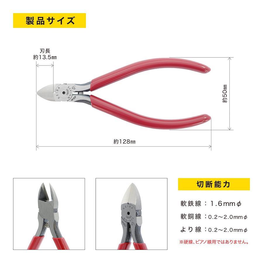 用途:切る切断能力:軟鉄線/φ1.6mm、軟銅線/φ0.2~2.0mm、より線/φ0.2~2.0mm仕様:スプリング付、材質:CR-V70C鋼全長:128mm、先端長:14mm、柄幅:50mm、頭部厚:6.5mm、先端角度:23度、刃長:13.5mm重量:70g