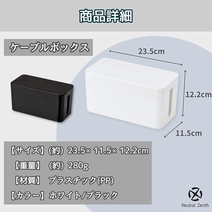 「商品詳細」商品内容:ケーブルボックスx1個 サイズ(約):23.5x11.5x12.2cm 重量(約):280g 材質:プラスチック(PP) カラー:ホワイト/ブラック