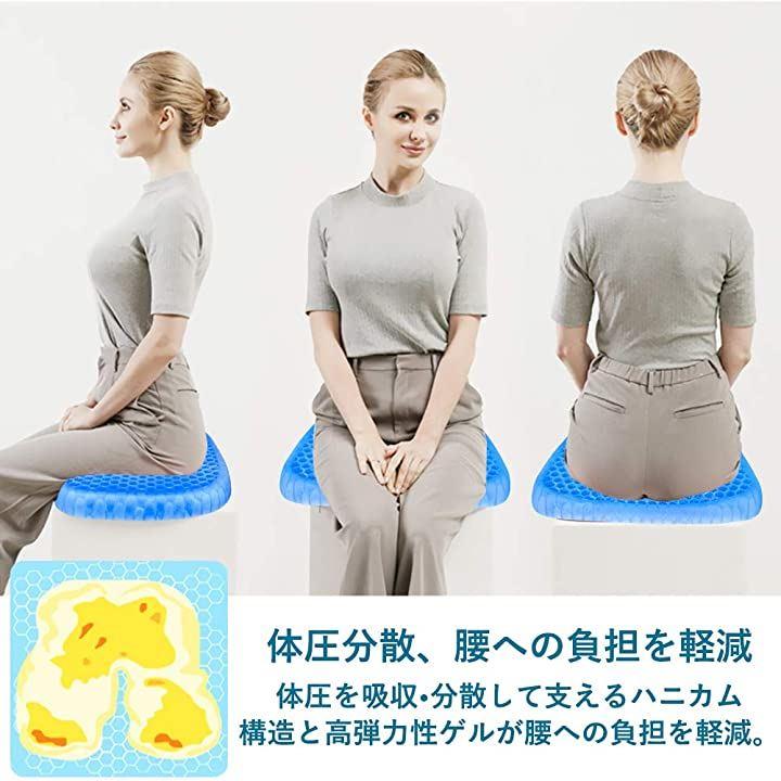 ・「新感覚のゲル素材」高弾性ゲル恒温素材採用して、適度な硬さが体圧を均一に吸収・分散して支えて、時間の座り作業によって引き起こす座姿勢の崩れ、術後や産後鎮痛、骨盤問題などに役立ちます。
