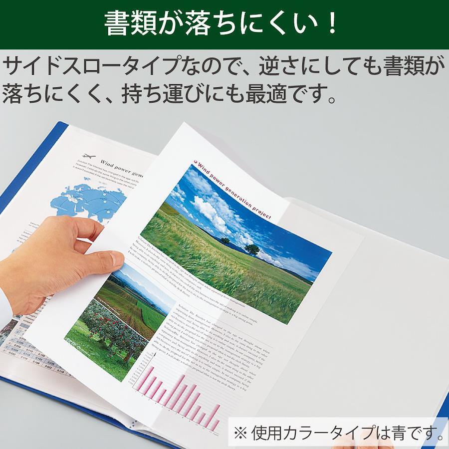 ●見開き両側のポケットとポケットの間隔が広く、書類の出し入れがしやすいサイドスロー(横入れ)タイプのクリヤーブックです。●A4書類だけでなく、見開きで倍の大きさのA3サイズの書類も収容することができます。●サイドスロータイプなので、持ち運びの際にクリヤーブックが逆さになってしまっても、中の書類が落ちにくくなっています。●3色のカラーラインアップがあり、色別に中身を分類して保管することができます。●表紙カラー/黄緑●中芯カラー/白●サイズ/A4-S●仕様/固定式・サイドスロータイプ・替背紙式・中紙なし・40ポケット●材質/表紙・中芯・ポケット:R-PP※背紙は裏返してご使用ください。