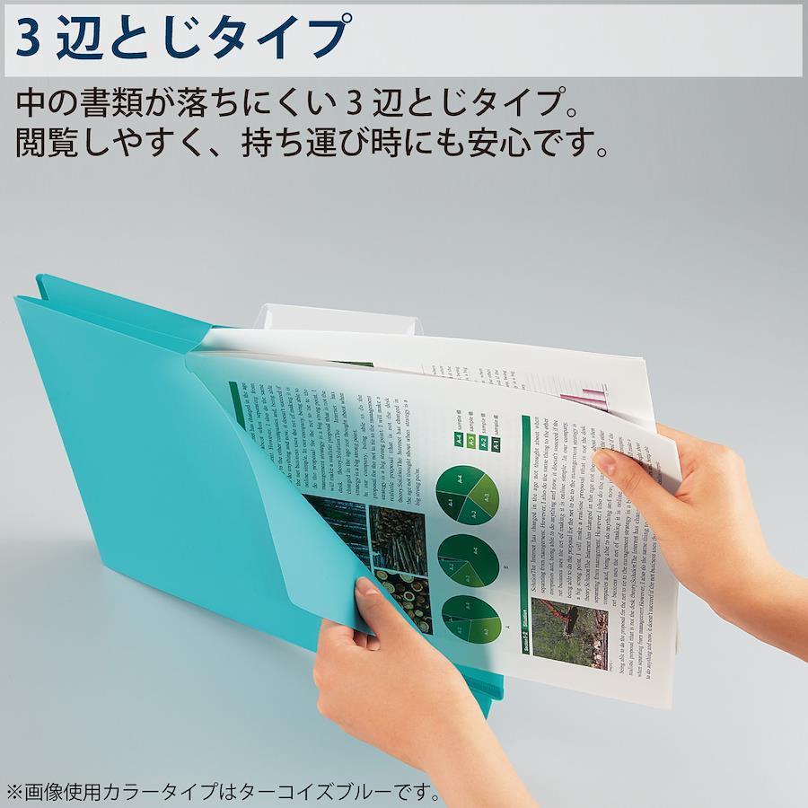 【3辺とじタイプ】立てて保管しても、持ち運んでも、中の書類が落ちにくい特殊な3方袋とじ形状。入り口が大きく開くので書類の出し入れもしやすくなっています。