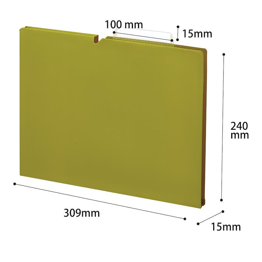 商品仕様●セット数/10冊●カラー/ライトオリーブ●サイズ/A4(309×240mm/見出し山高さ15mm)●マチ幅/15mm●材質/表紙:R-PPシート(厚み0.2mm)