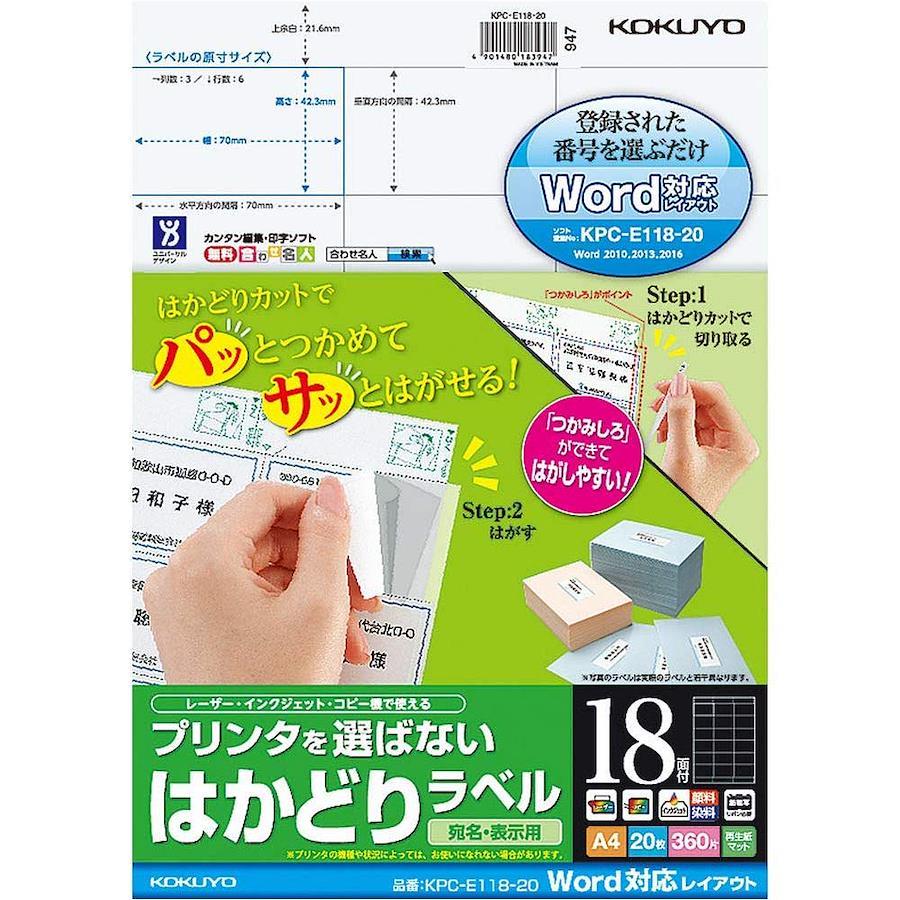 ●「Word」対応レイアウトの、プリンタを選ばないラベル用紙です。●ラベル余白部と台紙にミシン目が入っており、切り取るとラベルのつかみしろが一気に現れる「はかどりカット」を採用しています。大量のラベルを効率よくはがせます。●ラベルの余白部には、斜め方向のカットが入っているため、1枚ずつラベルをはがす場合も楽にはがせます。●レーザープリンタ・インクジェットプリンタ・コピー機などさまざまなプリンタで使えます。又、上下左右対称のカット内容なので、印刷時のずれを防ぎます。●マイクロソフト社の「Word」にレイアウトが標準登録されているので設定が簡単です。
