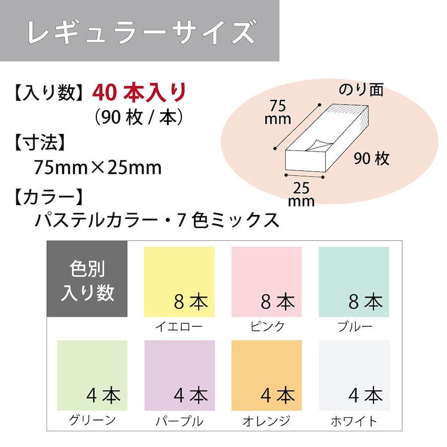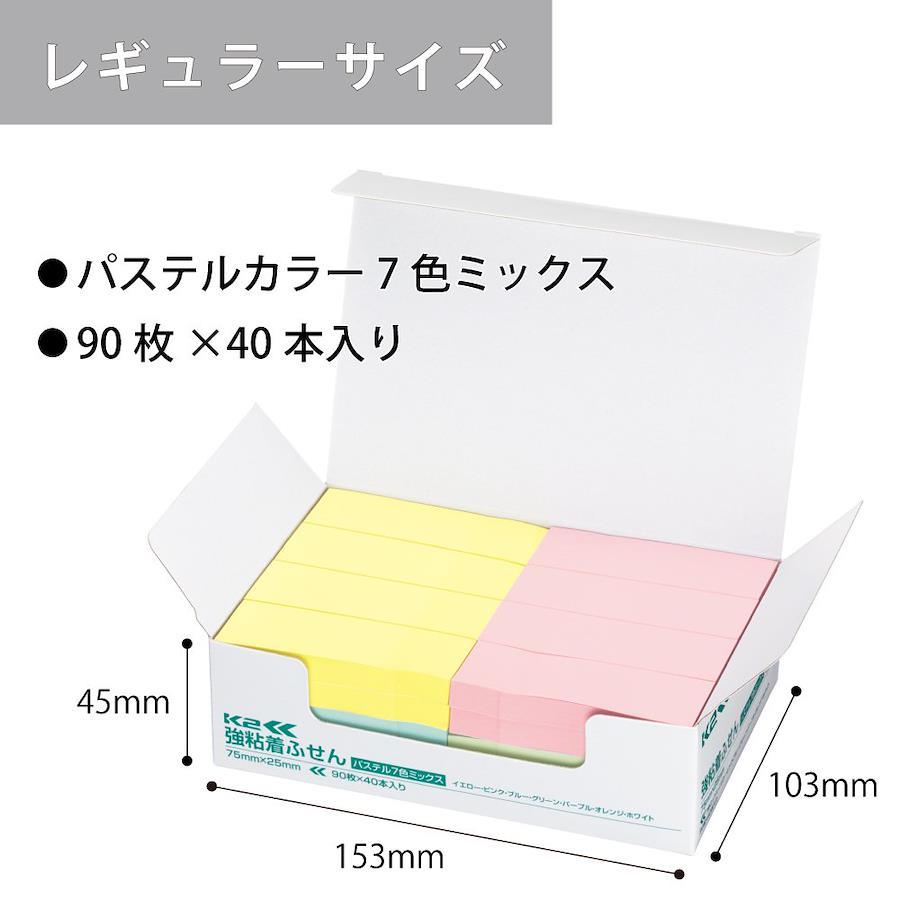 商品仕様●サイズ:レギュラーサイズ/25mm×75mm●枚数:90枚×40本入り●パステルカラー7色ミックス●強粘着タイプ●ふせん紙質:色特殊紙●紙箱入り
