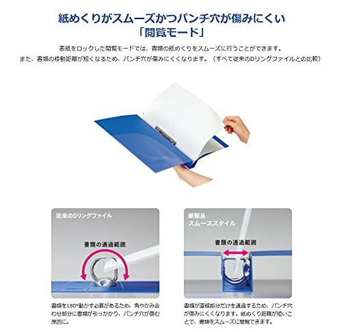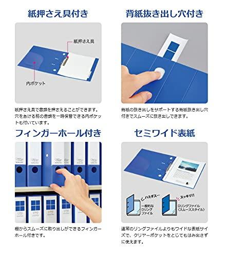 【商品説明】●ワンタッチで開く/リングを内側に片手でつまむだけで開き、上下のリングをつまむと閉じることができます。●しっかりロック/綴じ具がしっかりかみ合っているので、書類が抜け落ちる心配がありません。●まっすぐリング/書類の抜き差しをスムーズに行えるリング形状です。●閲覧モード/表紙をロックした閲覧モードでは、書類の紙めくりをスムーズに行うことができて、パンチ穴が傷みにくくなります。(従来のDリングファイルとの比較)●セミワイド表紙/通常のリングファイルよりもワイドな表紙サイズで、クリヤーポケットを綴じてもはみ出さずに使えます。●引き出し収容/コンパクトなとじ具の設計なので、デスクの引き出しにも収納可能です。●替え背紙式●背紙抜き出しホール/背紙の抜き出しをサポートする背紙抜き出し穴付きです。●フィンガーホール付き/棚からスムーズに取り出すことができます。●紙押さえ付き/紙押さえで書類を抑えることできます。●表紙ロック/表紙をロックをすると棚に並べた時に自立することができます。●内ポケット/穴をあける前の書類を一時保管できる内ポケット付きです。●綴じ枚数/500枚※ファイルの収容枚数の表示は、PPC用紙64g/m2を使用し、収容寸法1mmあたり10枚で算出しております。そのため、紙の種類によっては必ずしも計算通りにならない場合がありますので、一応の目安としてご利用ください。※クリヤーポケットのサイズによっては、表紙からはみだす場合がございます。