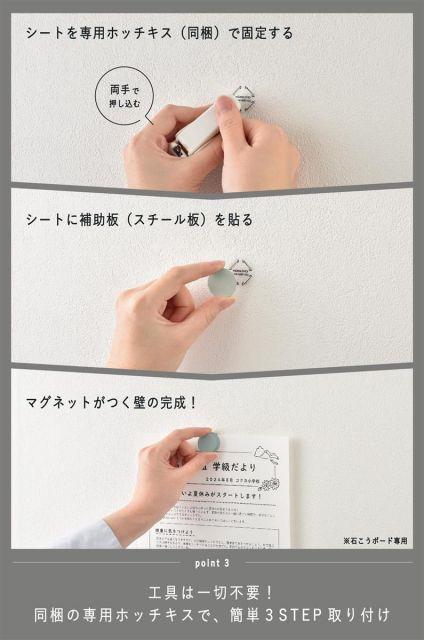 【Point1】石膏ボードの壁にマグネットがつけられるように。【Point2】工具不要、3STEPで簡単取り付け。【Point3】専用ホッチキスを用いるので、壁へのダメージはごくわずか。賃貸にも。
