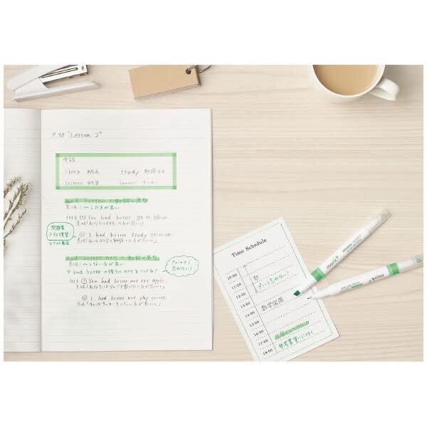 ●「めだたせカラー」はチカチカしにくいインク色を採用しているので、文字の上からのマーキングに適しており、「はっきりメモ」は濃いインク色の極細ペンで、重要な情報のメモに適しています●「めだたせカラー」と「はっきりメモ」は同系色のインクなので、2色使ってもスッキリまとまったマーキングができます●1本で2種類のマーキングができるので、ペンケースがかさばりません。