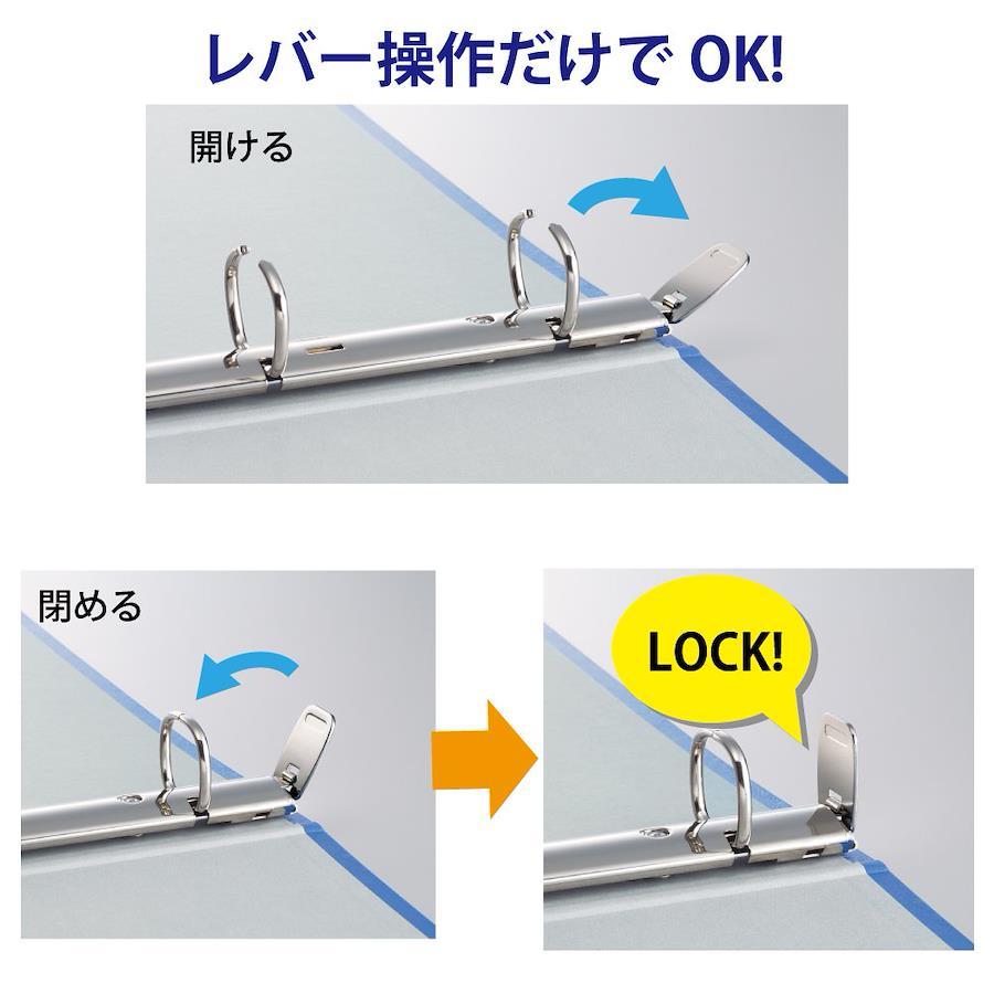 ●レバー操作するだけで開閉できるロック付き4穴リングファイルです。●ロック機構付きのとじ具を採用しており、とじ具の開きを押さえ、書類が抜け落ちないようになっています。●コクヨ独自の新機構により、リングの開閉、ロックをワンタッチで簡単に操作できます。●書類を保護するため、書類の両サイドに入れるプロテクターがセットされています。●機能的な分類には、背見出し紙の裏面をお使いください。