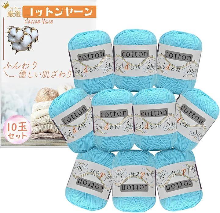 「サイズ」重量50g 長さ120m 10玉セット 「素材」コットン100% 「使用針」棒針3~5号、かぎ針2.5~4号 目安:マフラー1枚=3~4玉、ベビー服=5~6玉程度使用