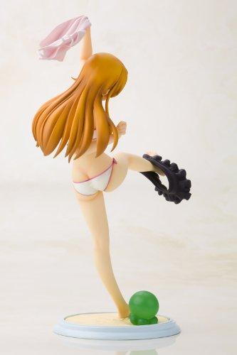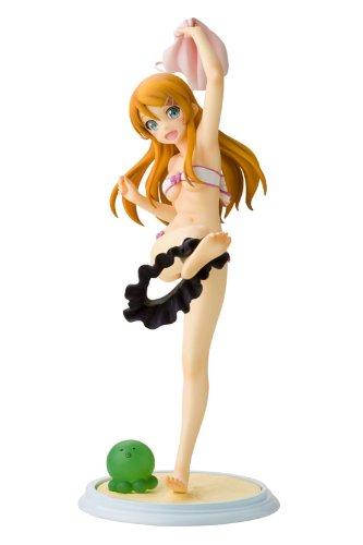 ライトノベル『俺の妹がこんなに可愛いわけがない』より、「高坂桐乃 ・・なわけがないver.」がフィギュアに登場!白い生地にピンクのラインとリボンがとってもキュートな水着姿は、アニメファンBOOKの表紙がモチーフ。思いっきり片足を蹴り上げ、服を脱ぐ瞬間をとらえました。桐乃らしい元気いっぱいな笑顔に、次の瞬間には海に向かって駆け出していきそうなダイナミックな動き、スレンダーな身体の造型など、見所いっぱいでお楽しみ頂けます。台座は砂浜をイメージ。ビーチボールになった「緑色のアレ」が付属し、お好きな位置に置くことが出来ます。コトブキヤ「俺妹シリーズ」の新ラインナップを、是非お手元でご堪能下さい!