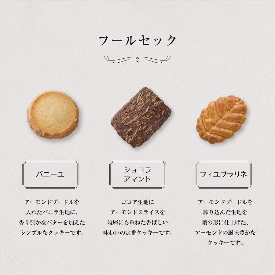 流行に左右されない味、シンプルさを追求し、素材にこだわった贅沢な焼菓子です。パルミジャーノレジャーノ:イタリアチーズのパルミジャーノレジャーノを使用して焼き上げた軽い塩味のクッキーです。フランボワーズ:バニラ味のクッキーに、ほのかな酸味のラズベリージャムをコーティングしたソフトクッキーです。カフェアマンド:ミルクコーヒー生地にアーモンドチップを入れ、苦味を効かせたコーヒー生地で巻いて焼き上げた2層のクッキーです。フィユプラリネ:アーモンドプードルを練り込んだ生地を葉の形に仕上げたアーモンドの風味豊かなクッキーです。バニーユ:アーモンドプードルを入れたバニラ生地に、香り豊かなバターを加えたシンプルなクッキーです。ショコラアマンド:ココア生地にアーモンドスライスを幾層にも重ねた、香ばしい味わいの定番クッキーです。