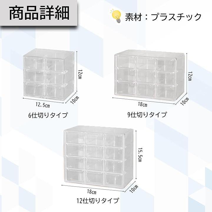 「商品詳細」6仕切りタイプ:12.5cm x 10cm x 12cm、9仕切りタイプ:18cm x 10cm x 12cm、12仕切りタイプ:18cm x 10cm x 15.5cm、素材:プラスチック*商品写真はできる限り実物の色に近づけるよう徹底しておりますが、 お使いのモニター設定、お部屋の照明等により実際の商品と色味が異なる場合がございます。