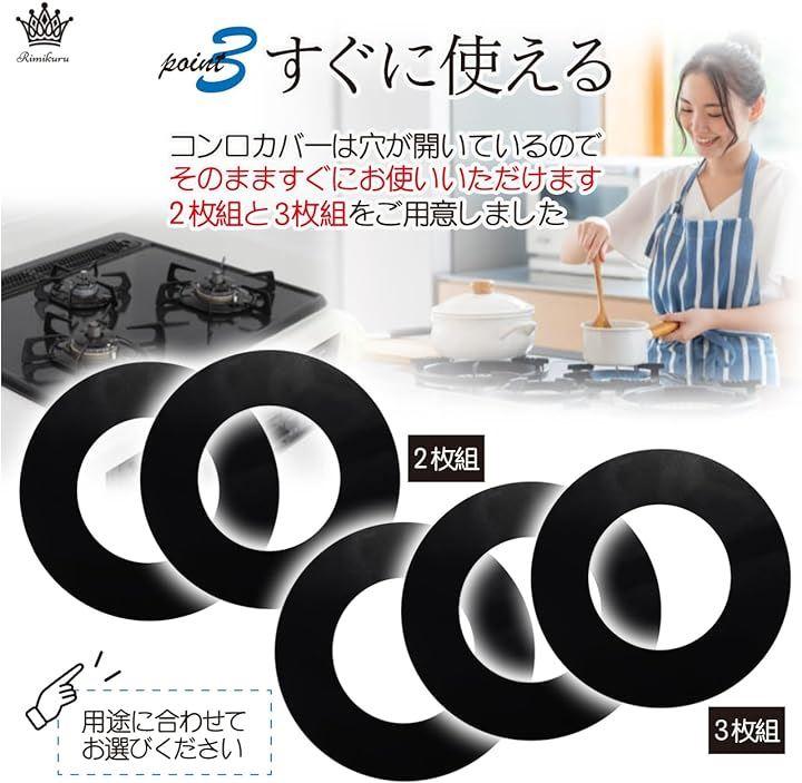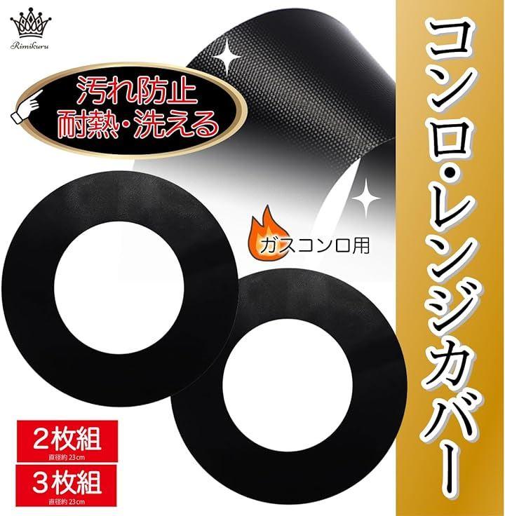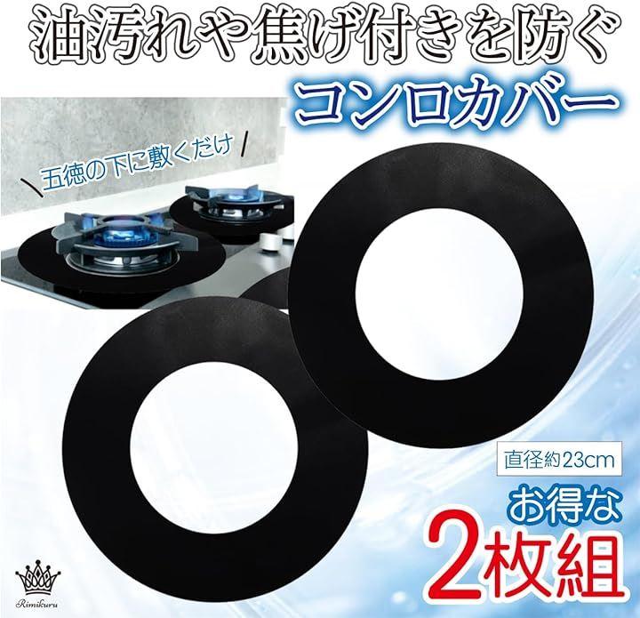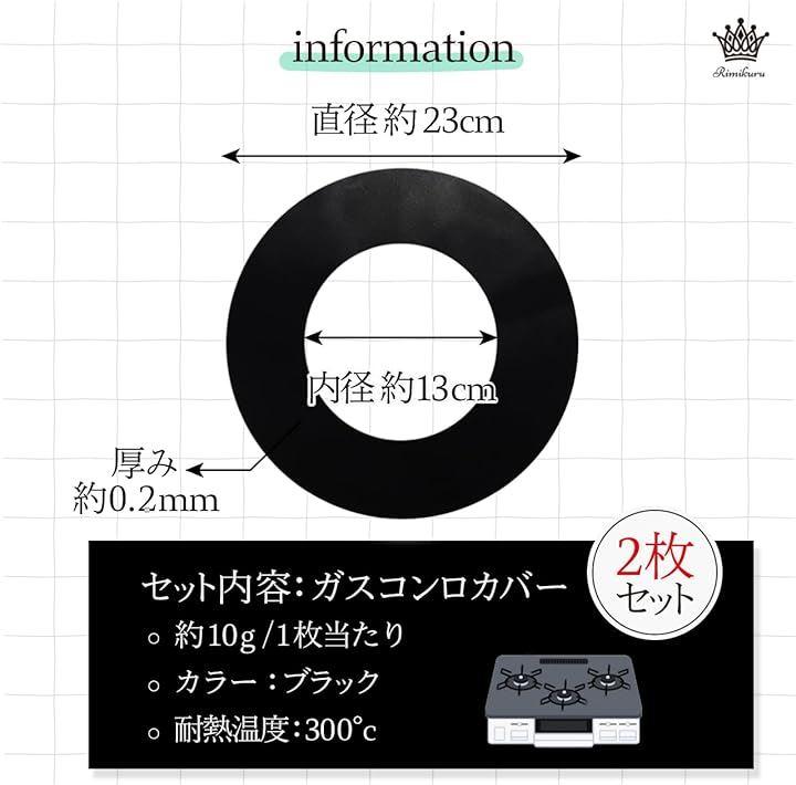 「商品仕様」セット内容:ガスコンロカバー x 2枚セット サイズ:直径 約23cm 内径 約13cm 厚み 約0.2mm 重さ:約10g/1枚当たり カラー:ブラック 耐熱温度:300℃ *モニターの環境等により、色の見え方に若干差が生じる場合がございます。