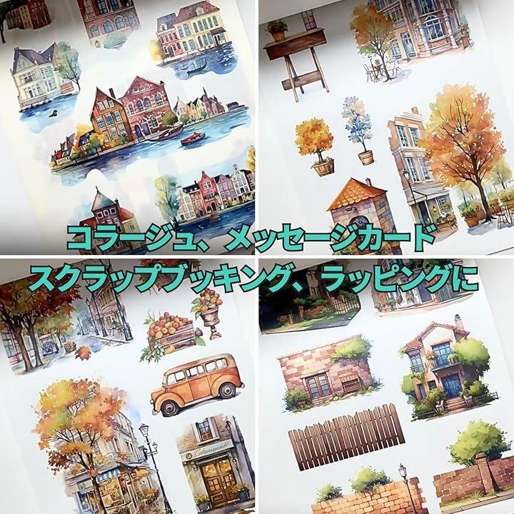 神秘的で美しいヨーロッパ風の建物やカフェ、街並みを水彩タッチで描いたおしゃれ。絵本から飛び出してきたような、可愛らしいミニチュアハウスや美しい街並みがデザインなどのステッカーブック